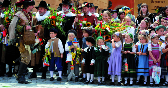 中世ドイツへタイムスリップ!ディンケルスビュールで開催されるこども祭り「キンダーツェッヒェ」の歴史パレードを見学♪ロマンチック街道をめぐり、人気観光地のノイシュヴァンシュタイン城も訪れます。ヴュルツブルクではワイン祭りも開催中!